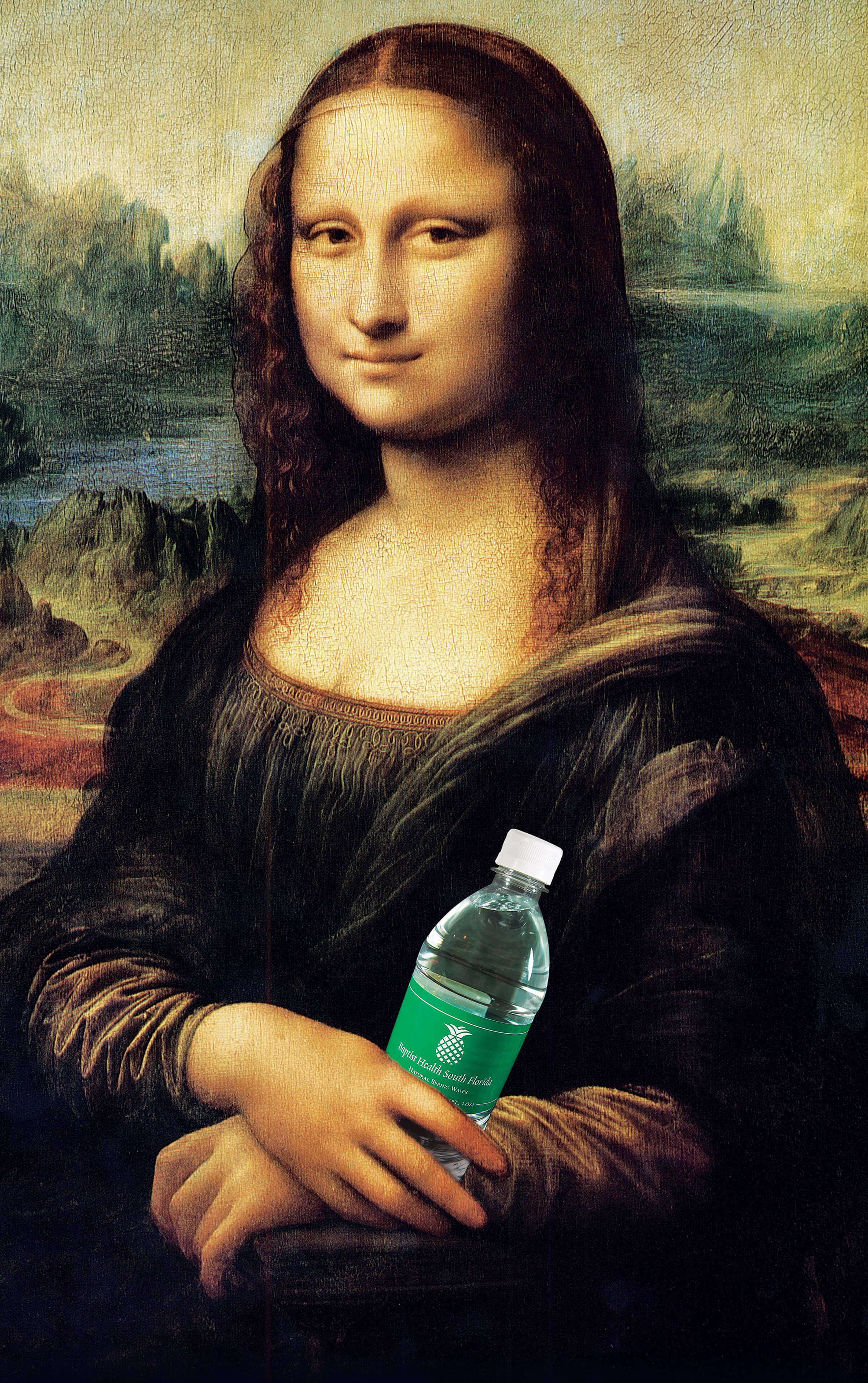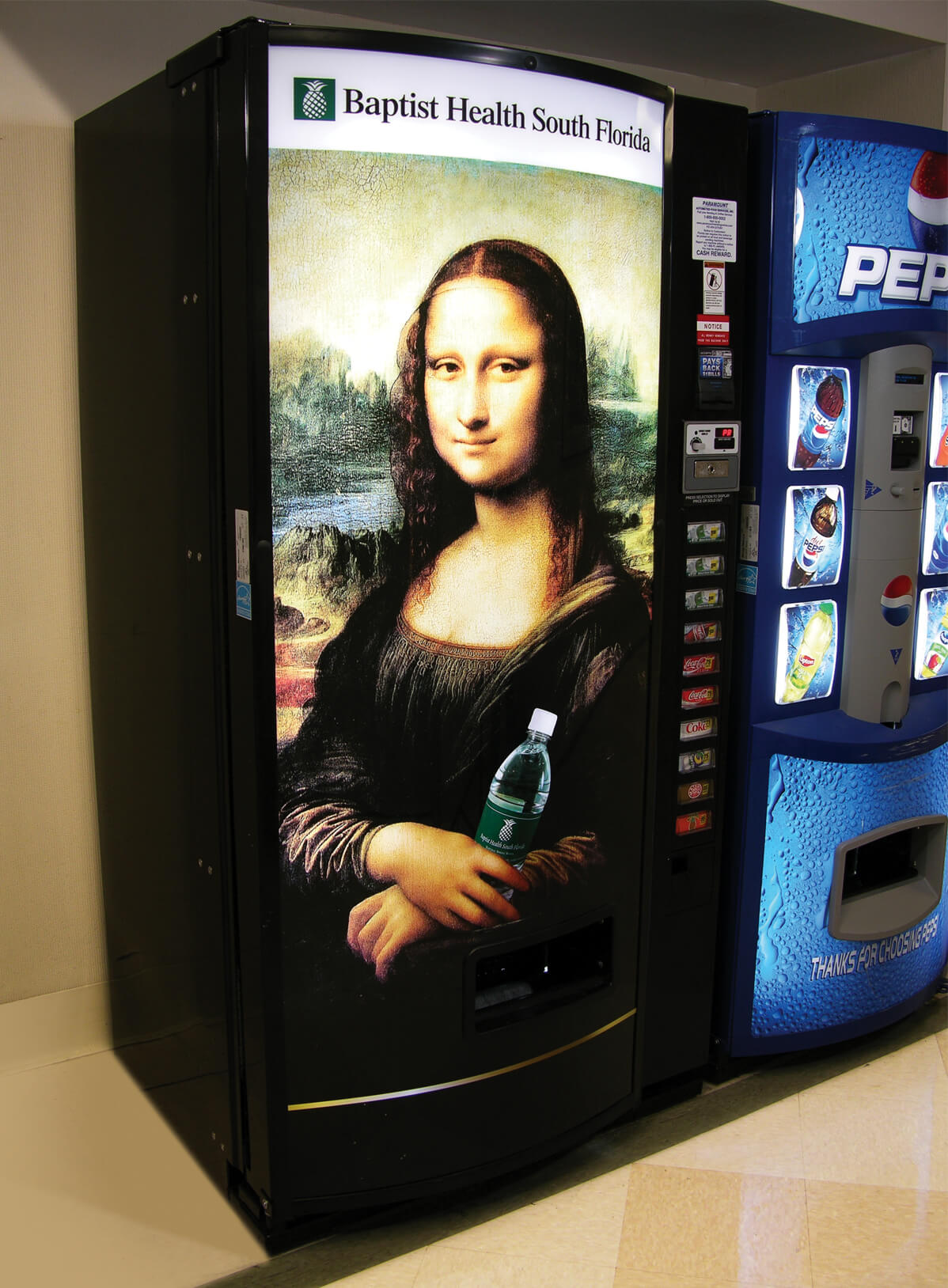 When Baptist Health South Florida asked Designapolis to design their beverage vending dispensers, they were inspired to have some creative fun with the project. Instead of using the usual stale, splashing water shots, they saw an opportunity to turn the monoliths into an ‘art in public spaces’ campaign. Leonardo’s iconic masterpiece, the Mona Lisa, was the first work of art featured. Other well-known artists, along with unknown local artists to support the local art community, were also to be highlighted.
