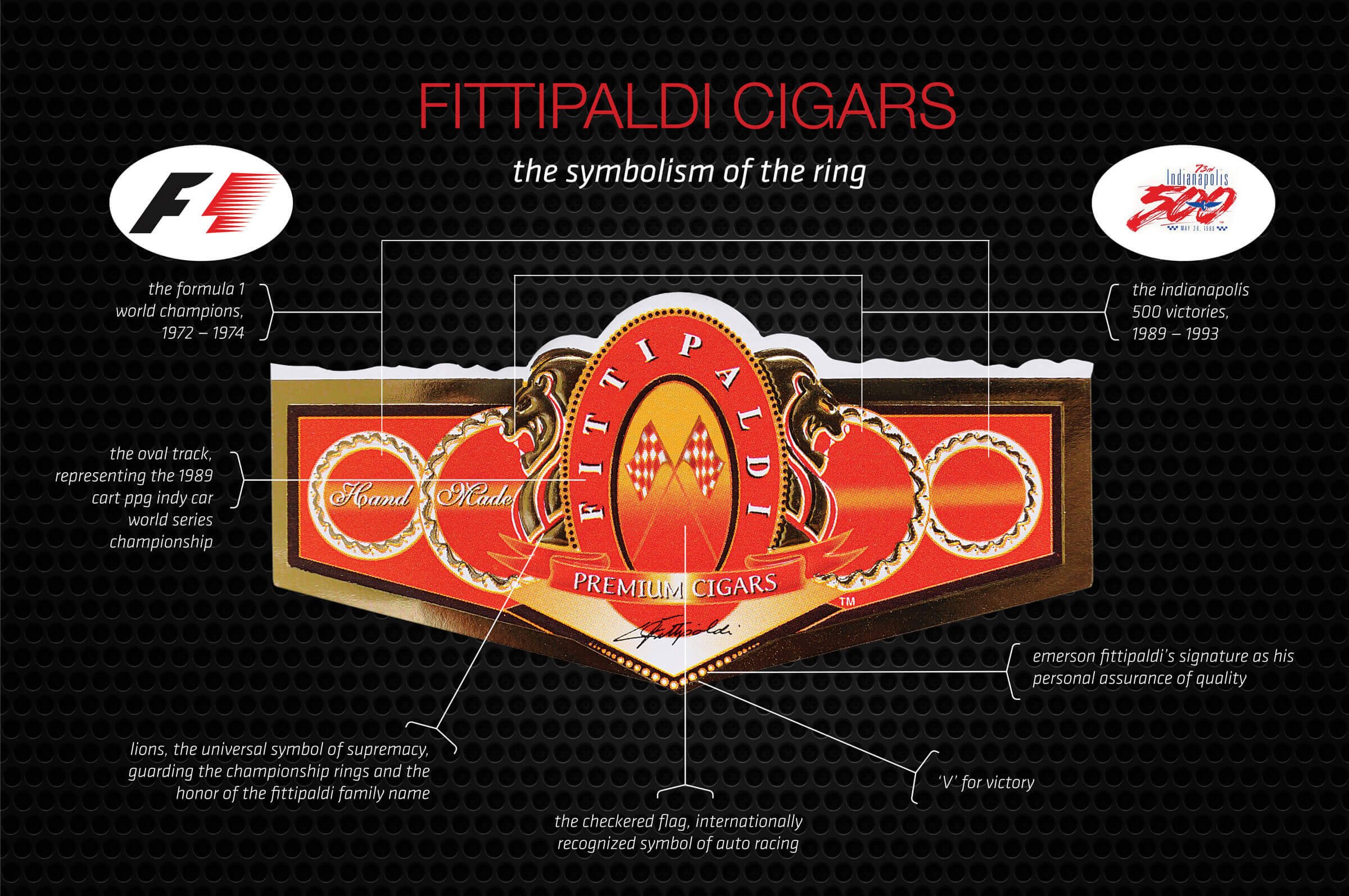 The Fittipaldi Cigar Company was founded by, and is the namesake of Emerson Fittipaldi, a Brazilian Formula One and Indianapolis racing champion. The brand combines two things the famed driver enjoys most: racing and cigars. The cigar label represents his legendary career and is full of rich symbolism, such as the red colored band and elements that portray the Marlboro World Championship Team. The hand-rolled cigars are impeccably packaged in an engraved, cedar wood box with branding extending to cases, lighters and ashtrays.